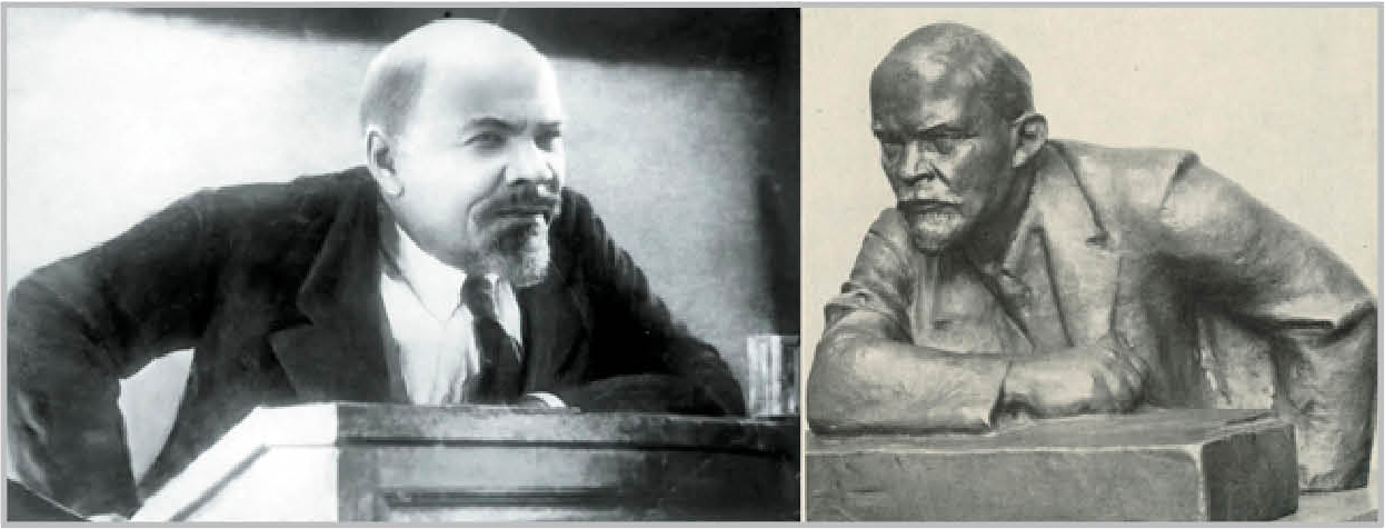 Коллаж из стоп-кадра фильма «Октябрь». В.Н. Никандров в роли В.И. Ленина. Режиссёры Г.В. Александров, С.М. Эйзенштейн. 1927. И скульптуры Н.А. Андреева «В.И. Ленин на заседании». Изображение взято из книги «В.И. Ленин в произведениях советских художников»: [альбом – М.: Советский художник,1967]. – С.37. Из фонда РГБИ.